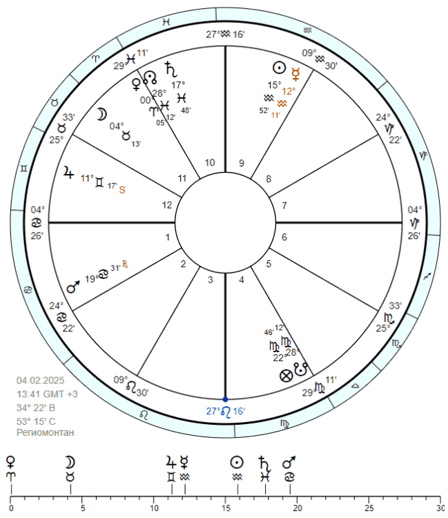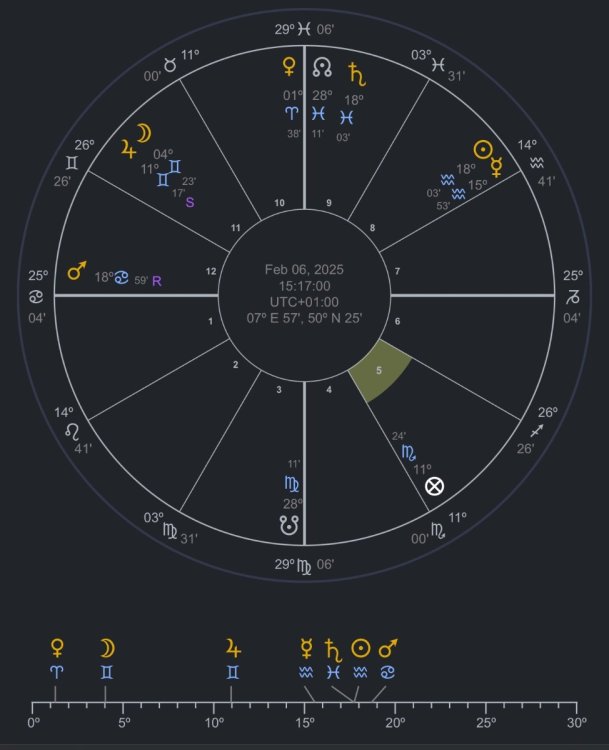 В хорарной карте (15.02.2025 22:17 34E22 53N15 +3) на время и место астролога выделен 1 дом. Это может показывать, что вопрос, обозначенный в заголовке темы сводится к вопросу здоровья. Планета кверента Венера находится в знаке изгнания. Это говорит об изъянах в здоровье. В контексте вопроса о ребенке это говорит о том, что здоровье на данный момент не позволяет ставить такую цель. Луна и антисное соединение Венеры с куспидом 12 дома выделяют 12 дом. Это говорит как о страхах кверента, так и скрытых болезнях. Меркурий - управитель 12 дома - хоть имеет положительные рецепции к Венере, но находится в зоне сожжения (под лучами), что является акцидентальным поражением. Это дополнительным свидетельством о возможных проблемах со здоровьем, которые если не видны сейчас, то проявятся позднее. Также в падении и планета мужа Марс. И Марс и Венера имеют негативные рецепции к Сатурну - управителю 5 дома - по изгнанию и падению, т.е. несут вред возможному ребенку. Больший вред можно предположить со стороны Марса - планеты мужа, потому что кроме рецепции он влияет на Сатурн еще, и находясь в близком аспекте.5 баллов