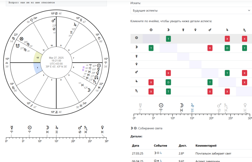 В карте на время и место астролога (24.02.2025 9:12 34E22 53N15 +3) выделяется Венера - управитель 7 дома – один раз Солнцем – мужской гендерной планетой и один раз как диспозитор Фортуны по экзальтации. Карта радикальна на тему отношений. Марс – управитель 1 дома экзальтирует Юпитер – управитель 8 дома - и соединяется с ним по антису – вам хочется понравиться девушке. Девушке – Венере в принципе нравится Марс – т.е. кверент. Но при этом сама планета находится в 12 доме каких-то блокировок и тайн. При этом Венера в оппозиции по антису с Сатурном – это может быть какой-то багаж прошлых неудачных отношений. Но Сатурн также может показывать и мать кверента, тогда это может обозначать будущий скрытый конфликт. Марс-кверент находится в падении и в оппозиции с Луной – также планетой кверента, его эмоциональной частью – и хоть Марс с Луной во взаимной рецепции, у кверента налицо какой-то внутренний конфликт. Марс по антису соединяется с куспидом 2 дома – идет поиск каких-то способов повысить самооценку. Но Венера находится в антисной оппозиции с Меркурием – управителем 2 дома самооценки кверента. Возможно, девушке не нравится нерешительность кверента или его ближайшее окружение. Чтобы действительно понравиться девушке, потребуется изменение своего поведения, предпринимать активные действия, может быть, корректировать свои отношения с родителями.5 баллов