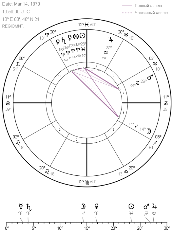 Здравствуйте! Каждая карта уникальна и даже несмотря на похожие паттерны, будет иметь свою структуру, свои уникальные черты. Рассматривать только один фактор вряд ли является целесообразным. Ваша карта (первая) действительно имеет похожие черты с картой Эйнштейна (вторая карта) наличием Луны в 6 доме и стеллиумом планет в 10-м. Но на эмиграцию в карте Эйнштейна указывала не только Луна, но и например Меркурий управитель 12 дома, который одновременно является управителем 10 дома по положению и по натуральным свойствам связан с научной деятельностью. Таким образом, деятельность Эйнштейна - Меркурий пересекалась с темой изгнания/эмиграции. Т.е. чтобы указание карты было ярким должно сойтись несколько факторов. В вашей карте Луна одновременно является управителем 1 и 12 домов и Луна в 6 доме акцидентально по положению управляет 12 домом. В принципе, возможна реализация темы изгнания, причем в вашем случае Луна является изначально поврежденной - находится в знаке изгнания. Но Луна может давать и проблемы со здоровьем или просто эмоциональную неустойчивость. Кроме того, для реализации события (например, эмиграции) требуется, чтобы имелась подходящая дирекция, которая высвободит накопленный потенциал. В вашей карте на время ухода из дома (май 2023) видна только следующая дирекция: Она может показывать например то, что ваши действия приводят к переезду. Но эта дирекция совершенно не яркая, она может позволять событию быть, но не является какой-то сильной действующей силой. Это наводит на мысль, что скорее всего ваша карта не ректифицирована, поэтому не показывает значимого события. А вообще в вашей карте явно центральное место занимает Марс. Он является диспозитором большинства планет - четырех плане в 10 доме, а также Луны как управитель по экзальтации. Также Марс является управителем 10 дома деятельности. И явно есть связь с 5 домом, которым Марс управляет по положению и как управитель дома по владению. Нужно конечно знать, контекст жизни, чтобы понять роль Марса в жизни, но конфликты или разрешение конфликтов по роду деятельности могут иметь место.