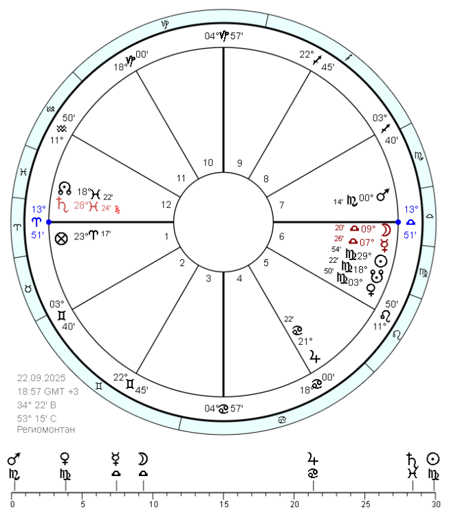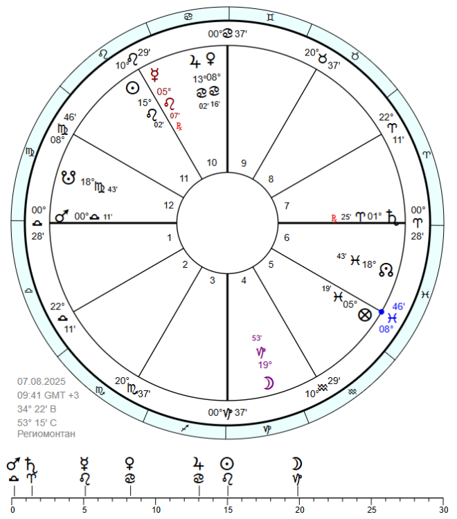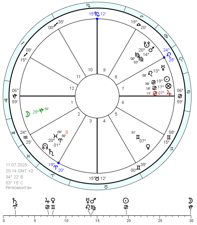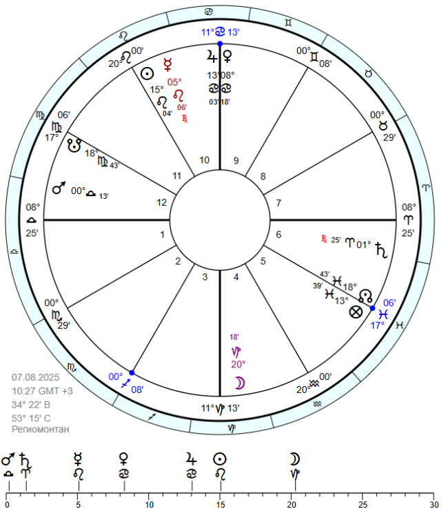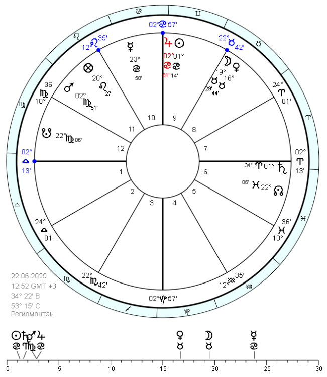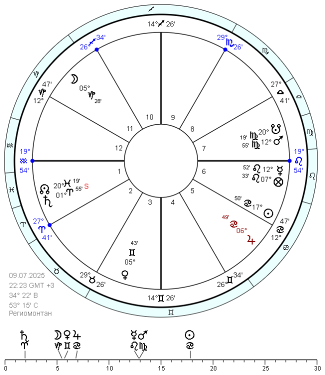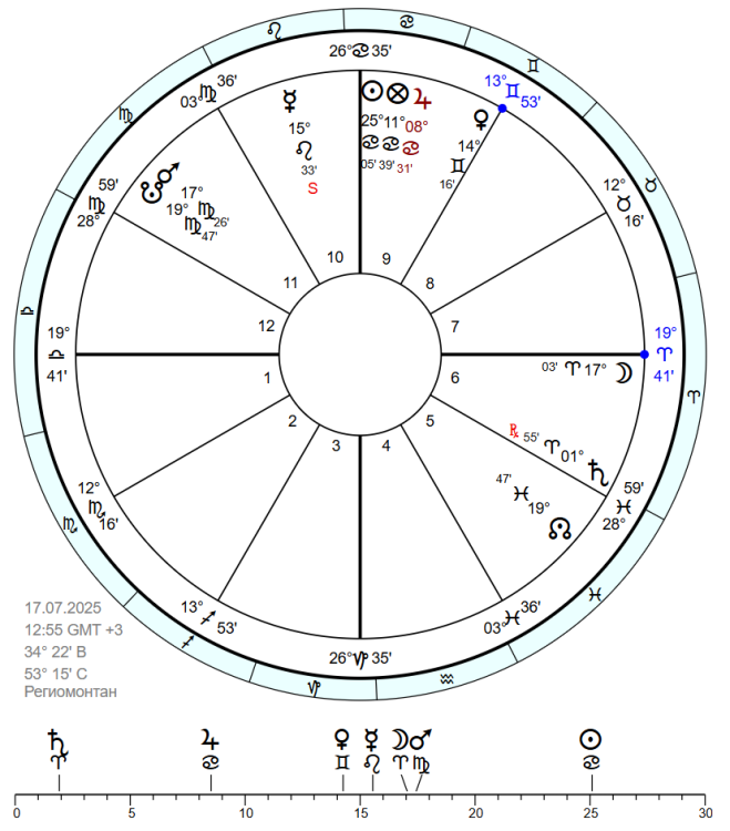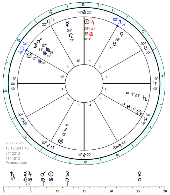 Если событие уже запланировано, но оно по какой-то причине не состоится, карта должна показать запрет для этого события. Ваша карта не выделяет 9 дом путешествий и скорее радикальна на какие-то финансовые вопросы. Карта на время и место астролога 30.06.2025 13:10 34E22 53N15 +3 Если учитывать, что антис Венеры соединен с Меркурием, управителем 9 дома, а также Луна выделяет Меркурий, то можно считать, 9 дом выделен. Какого-то запрета, который связан с Меркурием или Венерой У1 в карте не наблюдается. Отсутствие аспекта между Меркурием и планетами кверента не является запретом - событие уже запланировано, нам не нужно искать аспект. Значит, отпуск состоится. В карте есть соединение звезды Виндемиатрикс с Асцендентом. Обычно она имеет значение в вопросах отношений и, скорее всего, не особо значима по этому вопросу. Возможно, что она покажет какую-то "ложку дегтя", но в целом на вопрос состоится ли поездка влиять не должна.