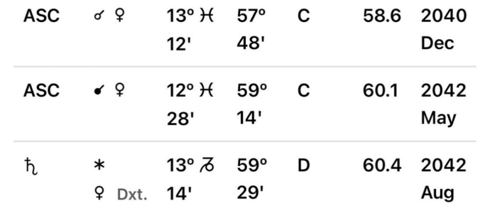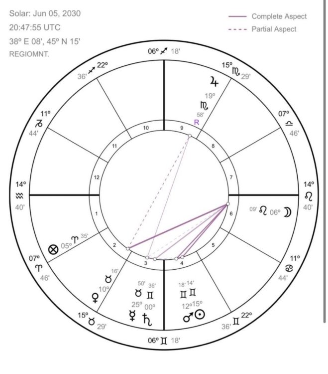 Здравствуйте. Попробую ответить на ваш вопрос. Надеюсь, раз вы пришли на этот ресурс, то готовы к любым ответам:) В вашей натальной карте планеты, детерминированные вашим 1ым домом - это Сатурн (планета в доме), Юпитер (у1), куспид 1го (АСЦ), а также Марс. Планеты, детерминированные 7ым домом-это Марс (планета в доме), Меркурий (у7), Венера (соуправитель 7го). Из возможных планет-промиссоров, которые могут дать вам брак - главным претендентом будет, в том числе и по натуральному свойству, Венера. Таким образом, секстиль Венеры 02°Тельца, Трин Венеры в 02°рыб, плюс квадрат Венеры 02° Весов - это точки, которые дадут возможность брака. Смотрим, есть ли такие дирекции и когда. Такая дирекция у вас есть в 2031 году: АСЦ секстиль Венера 02°Тельца. Соляр 2030 года подтверждает: Венера снова берет на себя роль 7го дома, то есть говорит о возможности брака, любовь приходит к вам. Здесь же обращает на себя внимание ось 3-9. Венера уже почти в 3ем доме, в аспекте с Юпитером, который проявляется через скорпиона в 9ом доме. В том числе Марс имеет отношение к вашему 1ому дому, при этом связывая ваш 9ый и находится при этом в соединении с Солнцем (у7 солярным). Также Венера аспектирует Луну, которая имеет отношение в натальной карте к 9ому дому, дому переездов через аспект к Марсу (у9 в натале). Как вариант, все это может говорить о заключении брака, возможности дальнего путешествия с партнером, а также и о переезде в связи с замужеством. Кроме того, также есть дарующая брак (возможность для брака) дирекция и в 2036ом году - Юпитер секстиль Венера 02°Тельца. Юпитер у нас отвечает за 1 дом, Венера - как всегда за любовь и относится в вашей карте к 7ому дому. Здесь также возможен вариант беременности, так как Венера в вашей карте еще и показывает детей (находится в 5 доме). Соляр 2035 года также дает подтверждение на возможность брака: Юпитер - это вы, Венера относится к 7ому, аспектируя солярного управителя 7го Марс, который также в натальной карте отвечает за 7 дом, а также находится в соединении с Меркурием (у7го натального). Или говорит о вопросах беременности. Юпитер подтверждает в соляре роль 1го дома, Венера - роль 5го дома (т.е. детей). Кроме того, куспид 1 дома (АСЦ) в соляре 2035 попадает прямо в 4ый дом натала, что может говорить о том, что год будет связан с вопросами семьи в принципе (расширение, увеличение семьи). Меркурий как у1 и у5 в соляре объединяет и тему детей на год. Таким образом, для вас открыт коридор возможностей на указанные периоды, но всегда важен контекст для реализации прогнозируемых событий. Поэтому многое зависит и от нас самих:) Удачи вам!